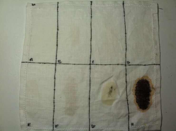 This recipe did the best overall of the ones I tested in 2014. I think if I had let the sample sit even longer in the solution it would have removed everything except the Ink and the Wax.